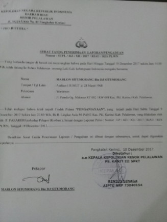 “Ya, sekarang saya sedang menuju ke Polres Pelalawan untuk membuat laporan tindakan penganiayaan yang terjadi pada diri saya,” kata Marlon menjawab wartawan via Whats App, minggu (10/12/2017), sekitar pukul 13.24 WIB.