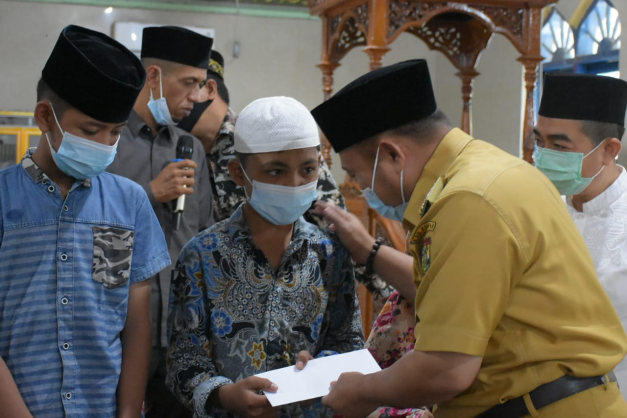 Bupati Kampar, Catur Sugeng Susanto Tengah Menyerahkan Santunan Secara Simbolis Kepada Anak Yatim