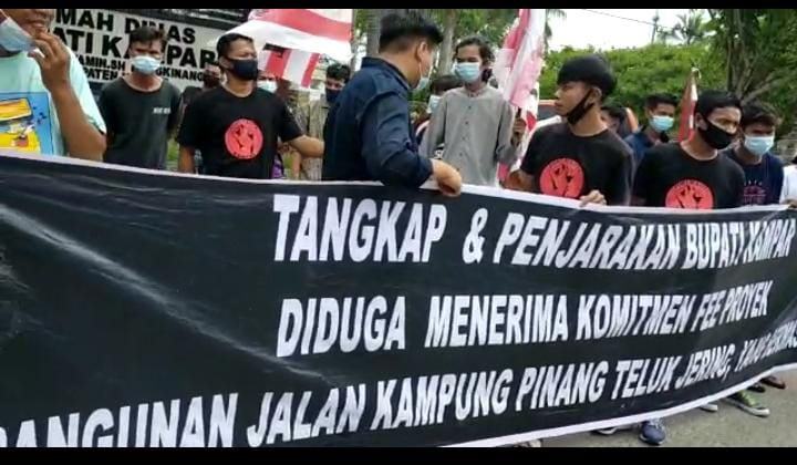 - BANGKINANG, SUARAPERSADA.com– Puluhan massa yang tergabung dalam Forum kota (Forkot) Kampar, dengan dikomandoi Andry Kurniawan, selaku Korlap, Senin (5/4/2021) menggelar aksi unjukrasa di depan Rumah Dinas Bupati Kampar, Catur Sugeng. Dalam aksinya, mereka mendesak aparat penegak hukum untuk menangkap dan penjarakan Bupati Kampar yang diduga melakukan tindak pidana korupsi dengan menerima Fee Proyek pembangunan jalan Kampung Pinang Teluk Jering yang sekarang bermalah.