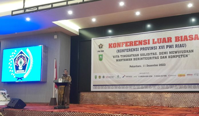 PEKANBARU, SUARAPERSADA.com- Pejabat (Pj) Walikota Pekanbaru, Muflihun, S.STP  menyampaikan berbagai program prioritas Pemko Pekanbaru yang sudah dan akan dilaksanakan oleh Pemko Pekanbaru dan mengajak insan Pers yang tergabung dalam PWI Riau untuk bersamasama membagun Pekanbaru untuk lebih baik.Hal tersebut disampaikan Pj Walikota Pekanbaru pada  acara Konferensi Luar Biasa (Konferlub) PWI Riau XVI tahun 2023, di Hotel Holywood Pekanbaru, Senin (11/12).