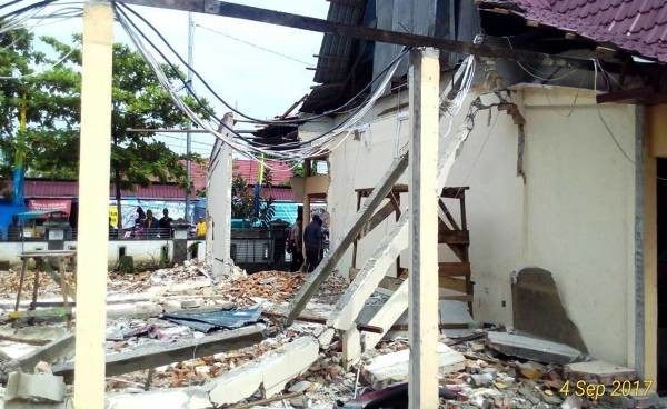 Sebelumnya pihak pekerja kontraktor telah melakukan proses pembongkaran dinding hingga atap bangunan yang lama, hanya terlihat beberap blok beton bangunan lama yang masih tersisa.