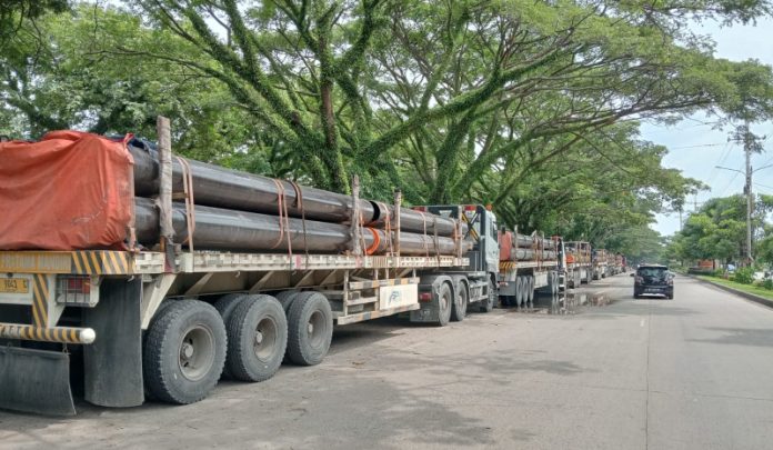 DUMAI, SUARAPERSADA.com – Beberapa unit truck trailer pengangkut Pipa Line diameter 18 inci tampak berjejer parkir di pinggir Jalan Putri Tujuh depan Kilang PT Pertamina Dumai mengeluh karena sejak Minggu sore, (12/10/2025) sekitar pukul 15.00 Wib mereka sudah sampai di depan Kilang Pertamina Dumai.
