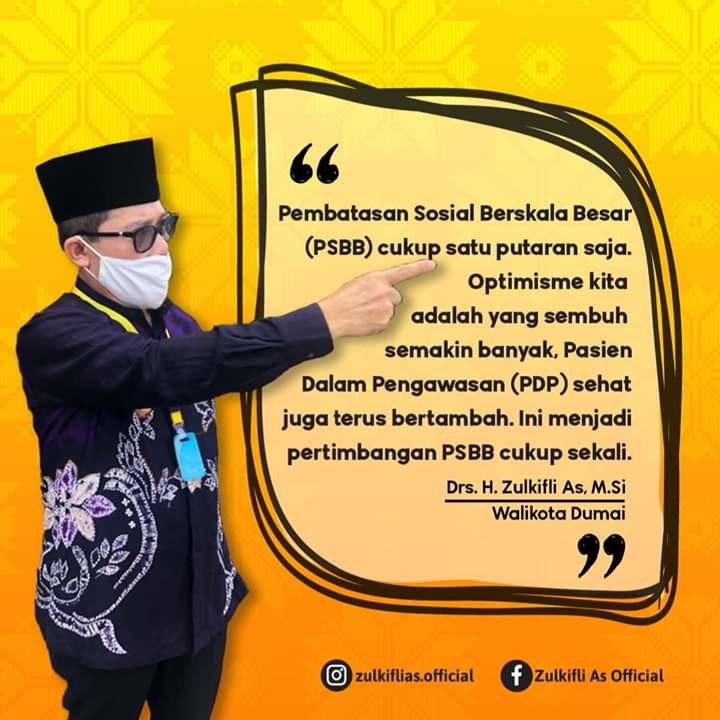“Hari ini, bersama unsur terkait saya menggelar rapat evaluasi mengenai pelaksanaan PSBB di Kota Dumai. Alhamdulillah, dari rangkaian rapat yang kita laksanakan, kita bersepakat bahwa pelaksanaan PSBB di Kota Dumai cukup satu putaran saja”, tulis Zulkifli AS di akun face book miliknya.